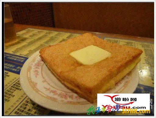 牛油西多士,下午茶的另一大王牌,兩片面包片正反沾了蛋液,合在一起下鍋炸,熱騰騰的上面放一片涼黃油片