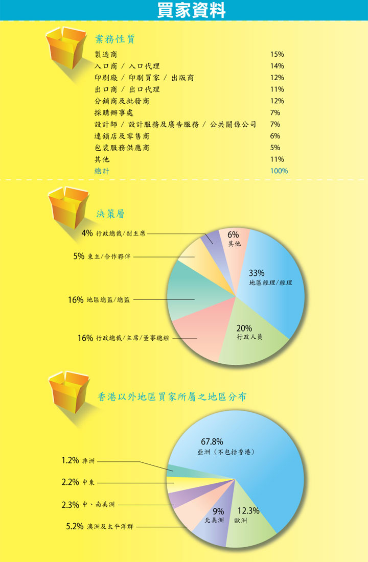 兩家主辦機構均會運用本身資源,發掘潛力優厚的買家,并邀請他們出席展覽會。2010年,印刷及包裝展吸引了101個國家和地區逾10,000名買家參觀,其中包括來自大型印刷及包裝公司、出版商和心意卡公司的決策人員,也有代表連鎖零售店、超級市場、食品飲料生產商、連鎖珠寶店、著名化妝品及電子產品品牌、餐飲服務公司等最終用家的買手。