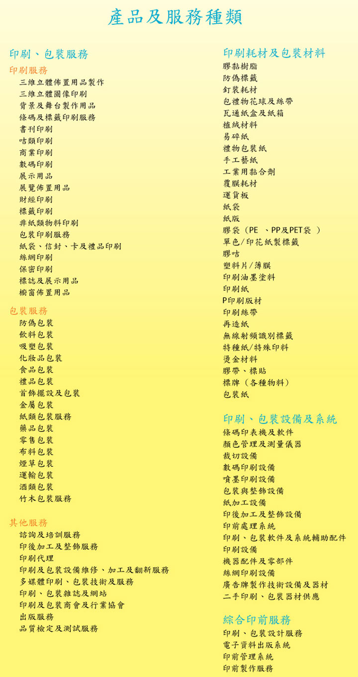 1. 環保印刷及包裝方案:網羅各類環保紙、環保墨水、環保印刷及包裝方案,其中一些環保產品包括來自國際監管機構認可的可持續管理林木所制成的紙張,以及可完全降解的塑料及塑料產品。