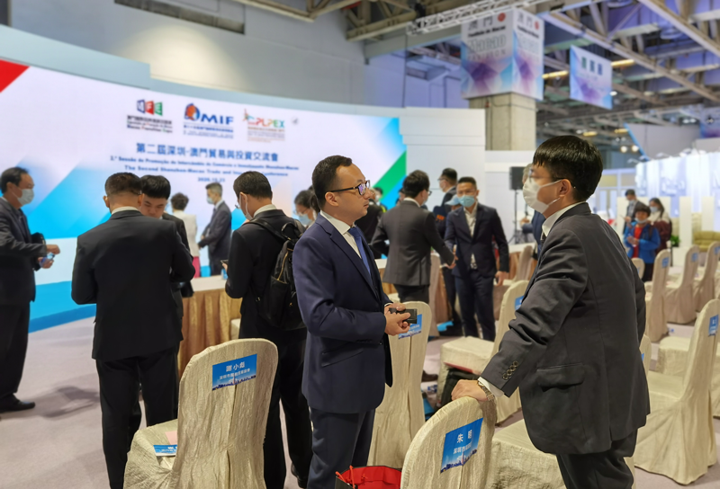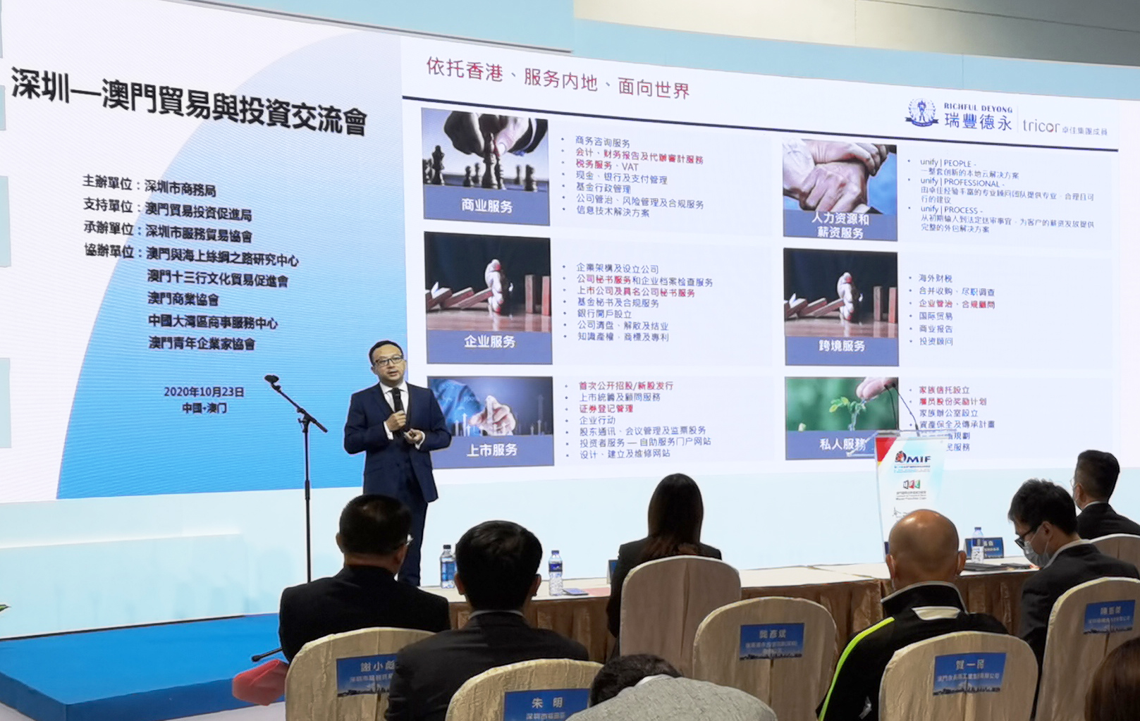 在10月23日上午舉辦的“第二屆深圳-澳門貿易與投資交流會”上,瑞豐德永集團CEO龔彥斌先生應邀就“瑞豐德永推動大灣區經貿合作案例”作了主題分享并與現場企業家們進行了答疑交流。
