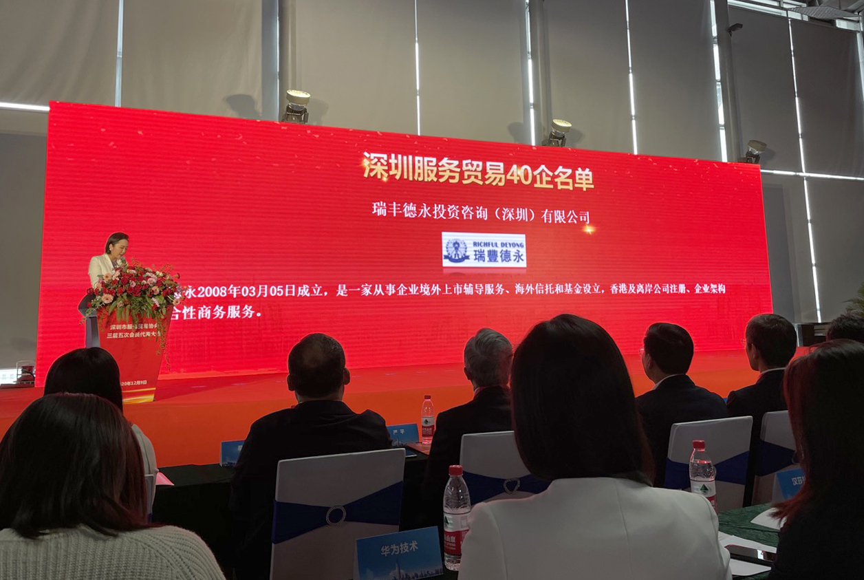12月9日,深圳市商務局主辦,深圳市服務貿易協會承辦的“深圳特區成立40周年服務貿易40企表彰大會”在深圳會展中心順利展開。瑞豐德永作為服務貿易示范項目受邀出席本次大會并獲表彰。
