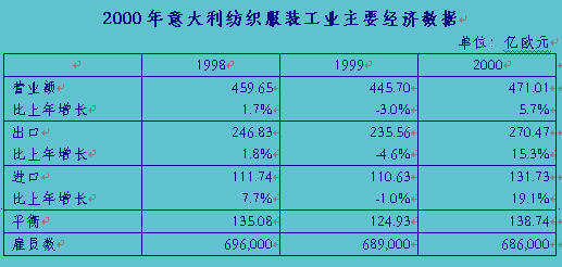 2000年全年意大利紡織服裝業出口總額約270.47億歐元,同比增長15.3%;進口約131.73億歐元,同比增長19.1%。外貿順差138.74億歐元。