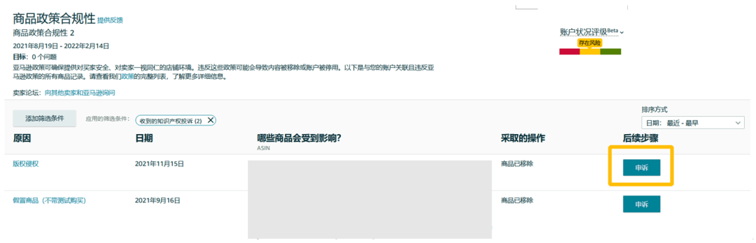 通過“商品政策合規(guī)性”頁面,您可以看到違反亞馬遜政策的商品記錄。當您看到“涉嫌侵犯知識產(chǎn)權” 、 “知識產(chǎn)權投訴” 兩欄內容有警示,則意味著可能存在侵權問題。接下來您可以對該頁面中顯示的違規(guī)問題進行申訴。