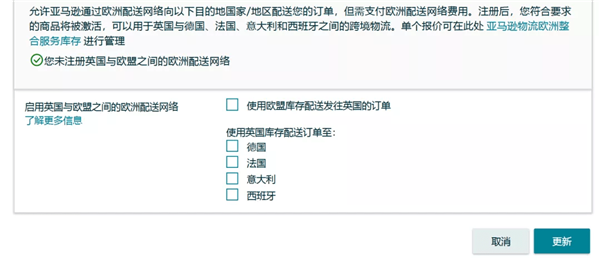 4.啟用目的國亞馬遜物流“配送計劃和出口設置”(【設置】 > 【亞馬遜物流】 > 【配送計劃和出口設置】 > “已啟用”);對于從歐盟(德國/法國/意大利/西班牙)到英國的歐洲配送網絡,賣家需要在所有歐盟國家(德國/法國/意大利/西班牙)啟用亞馬遜物流“配送計劃和出口設置”
