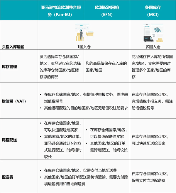 當您注冊并上傳了更多歐洲國家的VAT稅號時,您可以根據自身需求,選擇使用亞馬遜物流歐洲整合服務(Pan-EU)和/或多國庫存(MCI)。下圖將這三種配送方式進行簡單對比,供您參考。