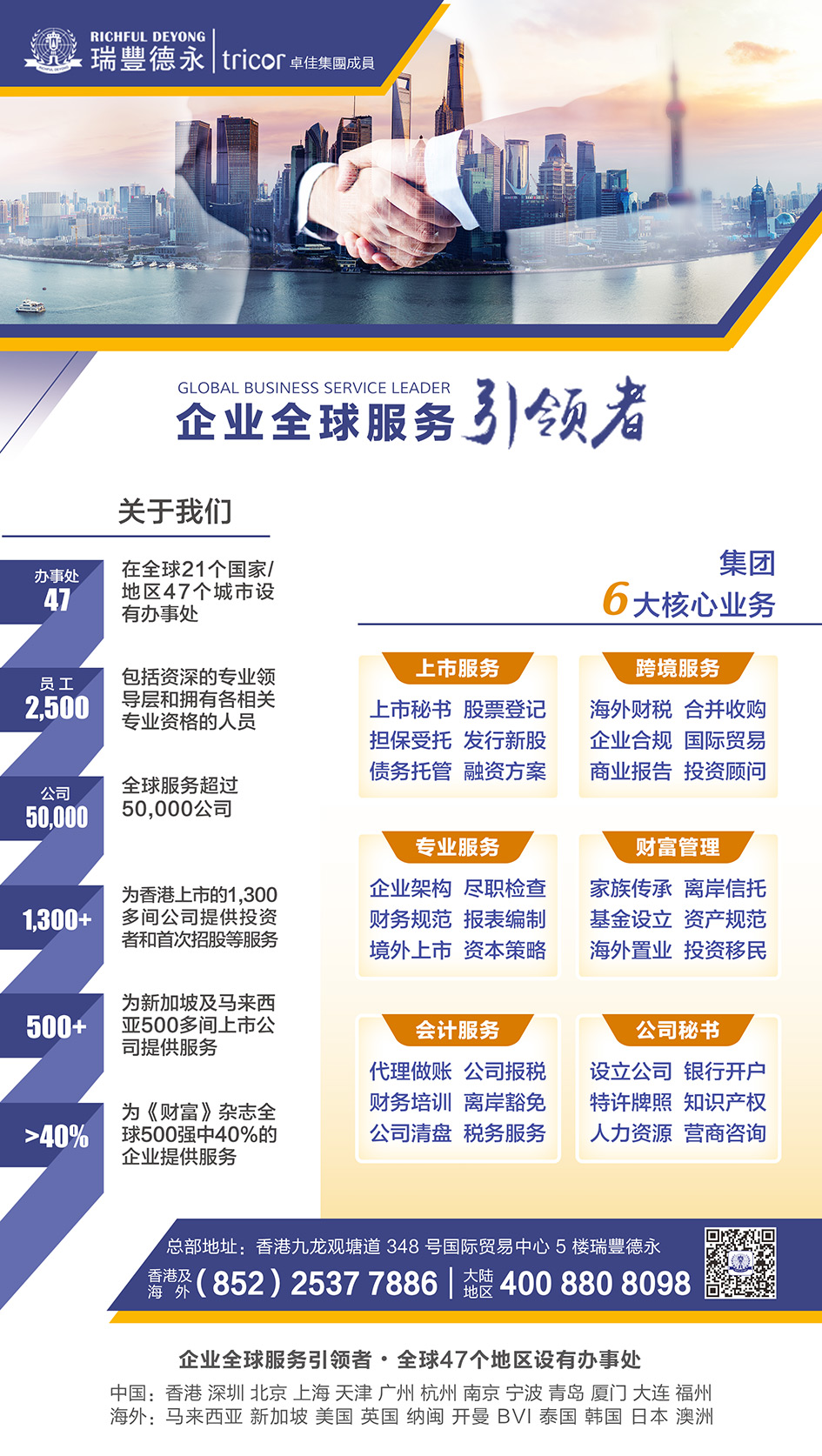 瑞豐德永(Richful Deyong)2008年始創于香港,系卓佳(Tricor)集團成員,是亞洲具有領先地位的專業服務機構,在全球21個國家/地區47個城市設有辦事處,擁有2500多名員工,服務超過30000多客戶,1300間香港聯交所上市公司,500間新加坡和馬來西亞上市公司,名列財富雜志500強企業超40%及眾多跨國知名公司。服務涵蓋:上市公司秘書、新股上市及股票登記、債務托管及授信,財富管理,海外信托和基金會設立,香港及離岸公司注冊,特許牌照申請,企業架構,財稅咨詢,會計安排,人力資源、薪酬管理,綜合性商務、企業及投資者服務等領域。
