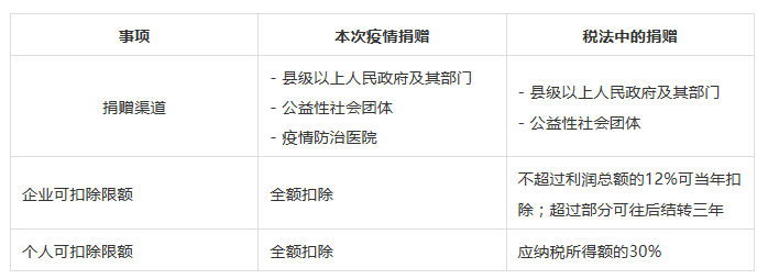 2、持承擔(dān)疫情防治任務(wù)的醫(yī)院開具的捐贈(zèng)接收函的企業(yè)和個(gè)人,其直接向承擔(dān)疫情防治任務(wù)的醫(yī)院捐贈(zèng)用于應(yīng)對(duì)新型冠狀病毒感染的肺炎疫情的物品,允許在計(jì)算應(yīng)納稅所得額時(shí)全額扣除。