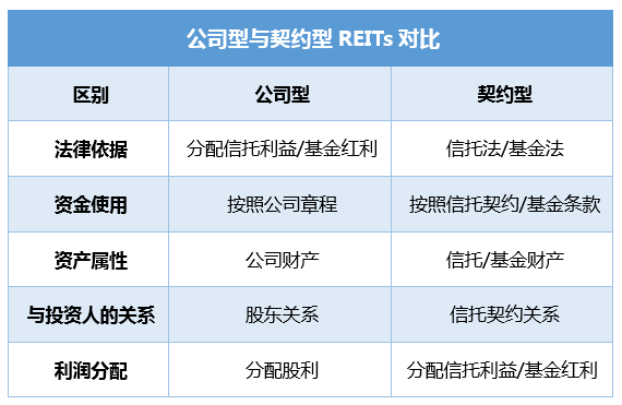 根據組織形式的不同,REITs可以分為公司型和契約型兩類。具體采用哪一種形式取決于當地對于 REITs法律載體的規定,不同的載體由不同的法律法規約束,受不同的監管機構監管,具有不同的行為和運作模式。