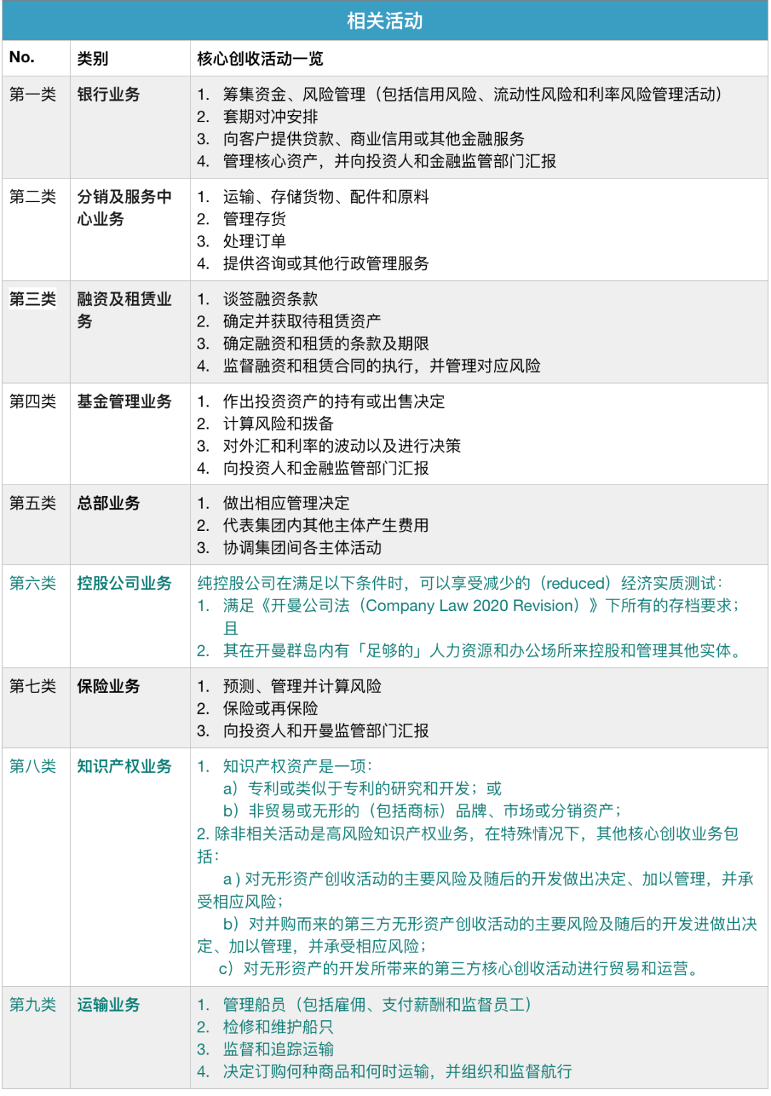 “相關活動”包括九個類別:控股公司業務、總部業務、基金管理業務、融資和租賃業務、知識產權業務、船運業務、分銷和服務中心業務、銀行業務、保險業務。