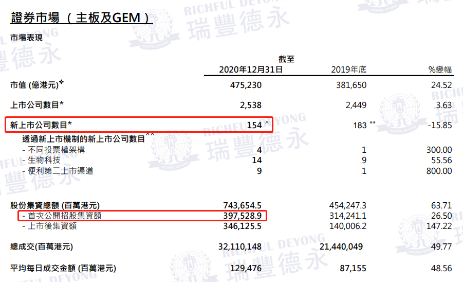 2020年香港新股市場表現奪目,整年香港交易所總集資額全球排名第二,全年共有154新股上市,盡管受到新冠疫情影響,2020年全球宏觀經濟表現欠佳,但是融資額高達3975億港元,同比增加26.5%,第一名將是美國納斯達克,緊跟香港的是上海證券交易所排名第三。