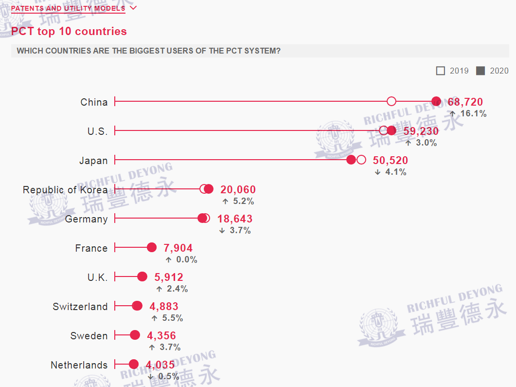 數據顯示,2020年,全球GDP預計降低3.5%,但2020年的《專利合作條約》PCT途徑提交的國際專利申請量比較2019年增長了4%,達到27.59萬件申請,這是有史以來的最高數量。