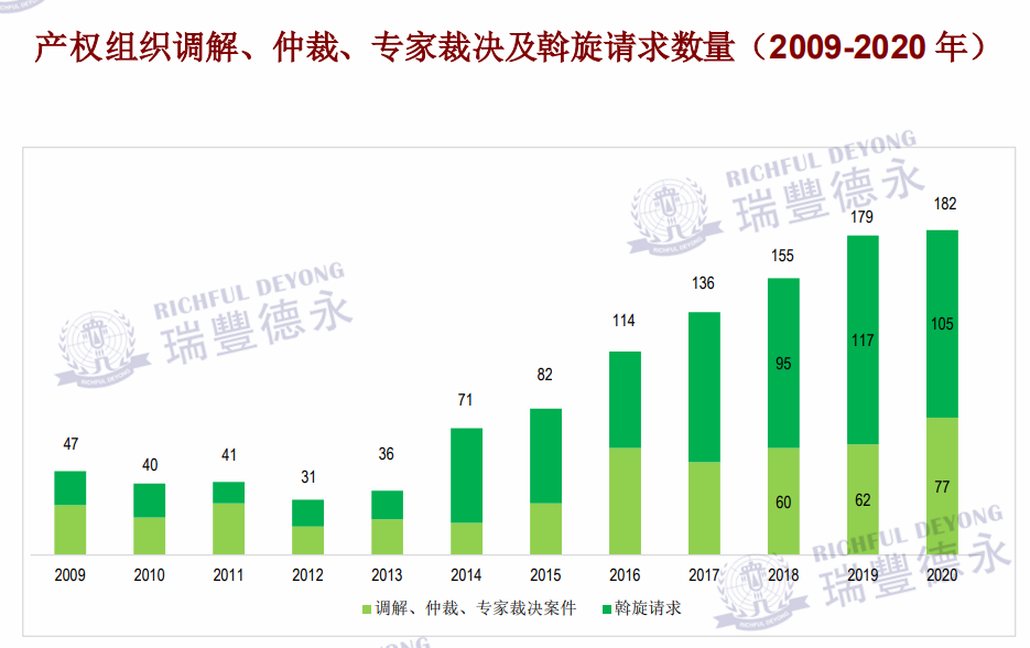 根據世界知識產權組織發布的最新數據顯示,自2013年以來,世界產權組織調解、仲裁、專家裁決及斡旋請求數量逐年增長,2020年創下新高一共182件,調解、仲裁、專家裁決案件77宗,斡旋請求105宗。