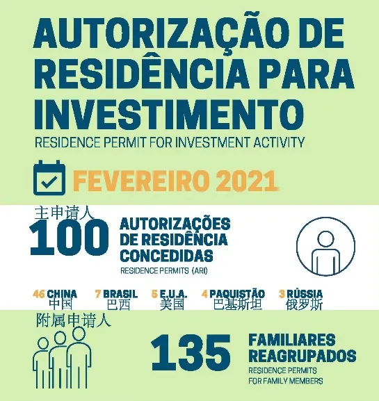 根據葡萄牙移民局(SEF)發布了2021年2月分黃金居留許可數據,2月份葡萄牙SEF向235位申請者(100位投資人+135位家屬)授予了黃金居留許可,相比2021年1月份獲批的135位申請者(55位投資人+80位家屬)環比增長了82%。
