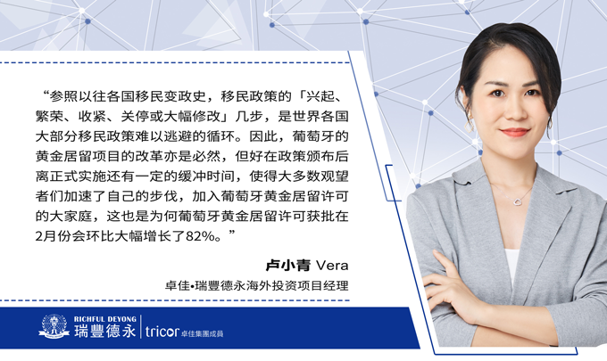 面對葡萄牙2月黃金居留許可大幅增長的數據,瑞豐德永海外投資項目經理盧小青女士分享了她對當前葡萄牙投資移民形勢的見解。