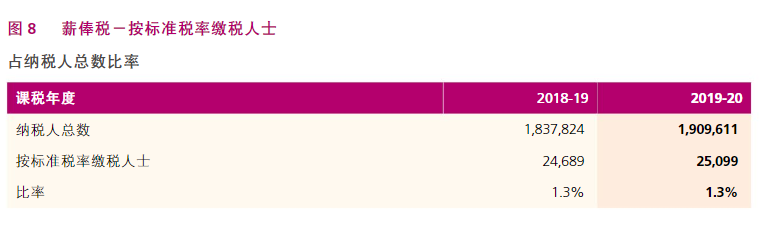 2019-20課稅年度按標準稅率繳稅的人士有25,099名,較上年度增加了410名。在薪俸稅最后評稅總額中,按標準稅率繳稅的人士佔35.7%,較上年度下跌1.9%。
