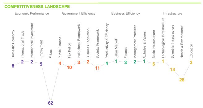 全球競爭力報告報告覆蓋了全球67個經濟體,并對這些國家在經濟表現、政府效率、商業活力和基礎設施建設等四大領域的表現進行了全面的評估,包含了164項競爭力指標。