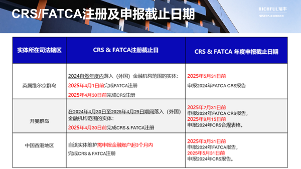 如果您仍然不確定實體是否落入CRS/FATCA范圍,或者需要我們協(xié)助注冊/申報等合規(guī)事宜,請盡快聯(lián)系為您提供專屬服務的RICHFUL瑞豐客戶經(jīng)理,以尋求支持,我們將竭誠為您服務。
